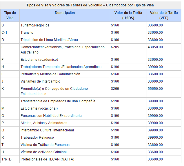 La tarifa de solicitud para los tipos de visa de no-inmigrante más comunes es de US$160. Esto incluye visas de turismo, negocios, estudiante e intercambio. La mayoría de las visas que se basan en peticiones, como las visas de trabajo y visas de trabajadores religiosos, cuestan $190. Las visas K cuestan US$265 y el valor de la tarifa/cuota/arancel para visas E es de US$205. Las tablas que se muestran a continuación son una lista más completa de los tipos de visa y tarifas de cada una.