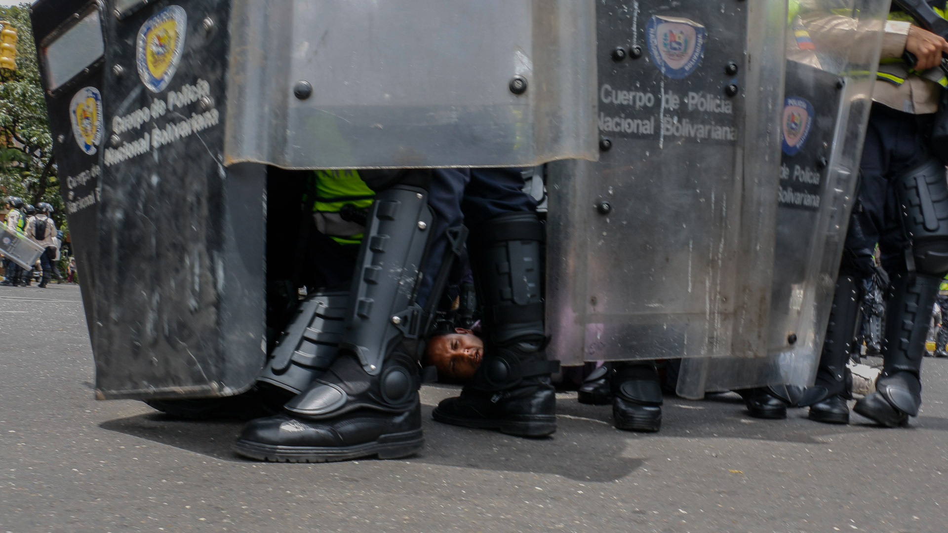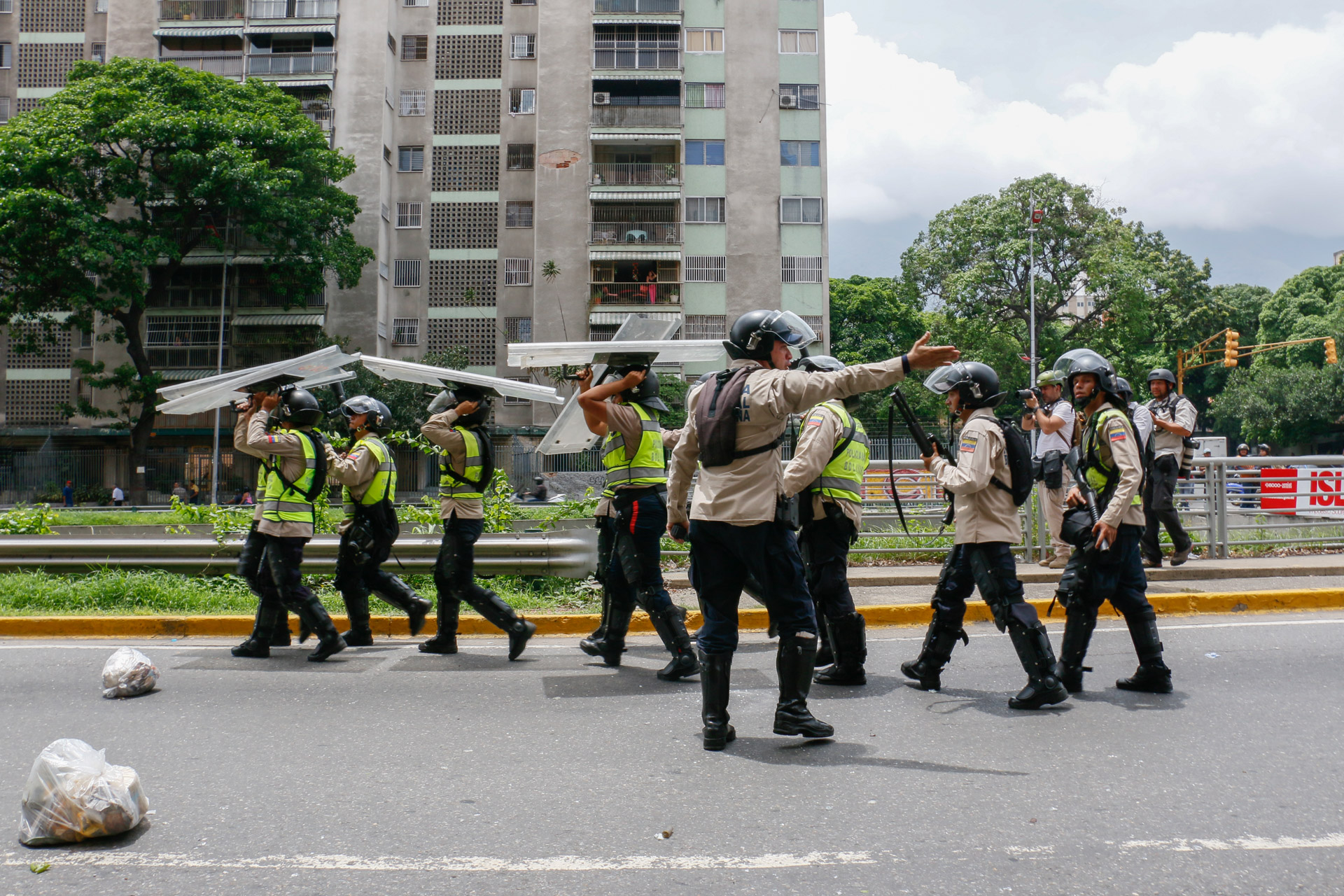 Los funcionarios se tapaban con los escudos antimotín para cubrirse de las botellas que les lanzaban los residentes de uno de los edificios de la Gran Misión Vivienda Venezuela mientras perseguían a los manifestantes