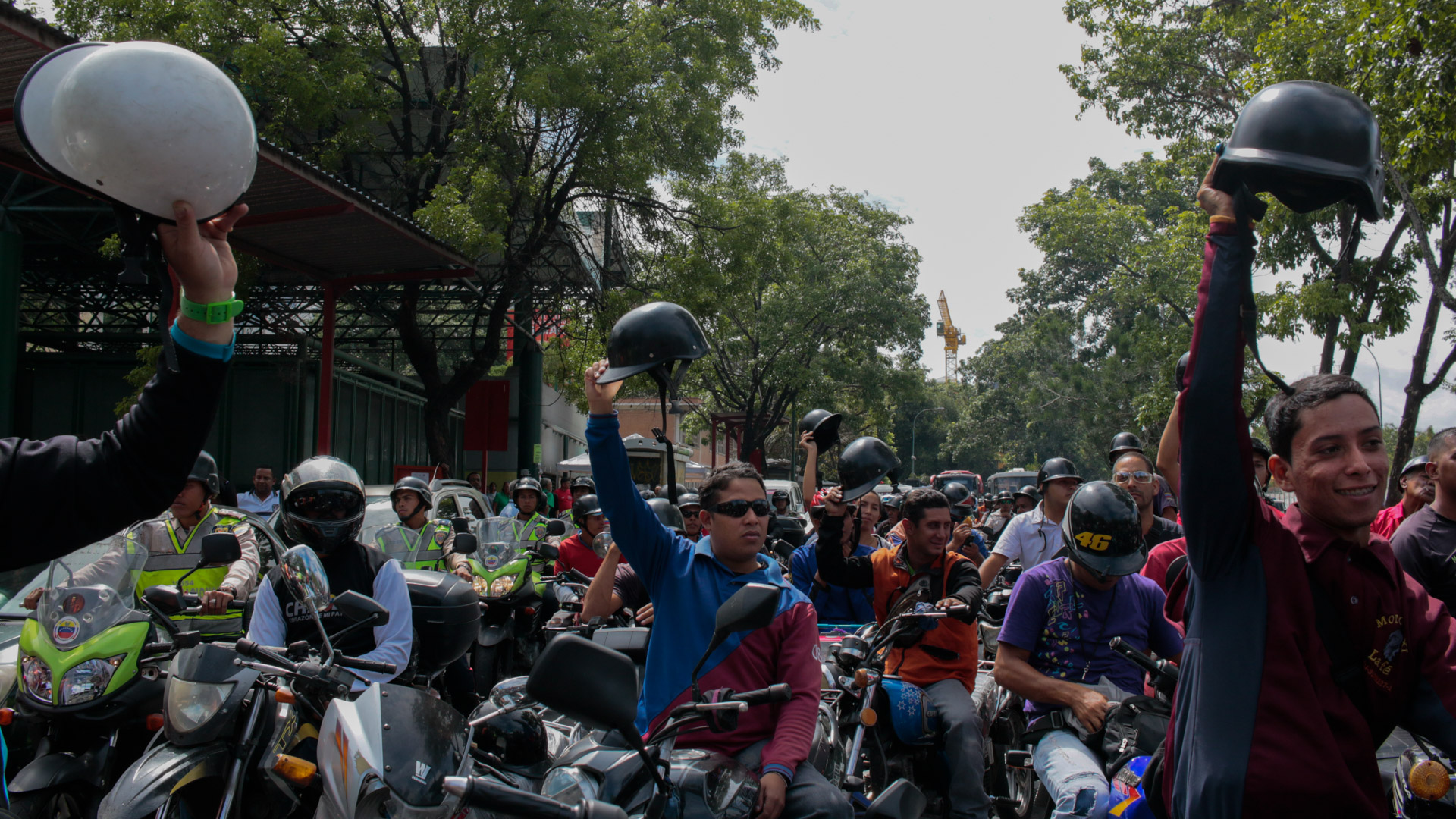 Su dirigente, Katy Aponte, los lideró hasta Miraflores, donde se encontraron con el resto de los beneficiarios de la Misión Transporte. Entre taxis, autobuses y motos había aproximadamente 2.500 vehículos. Habían prometido la asistencia de por lo menos 20 mil motorizados.