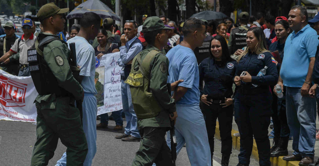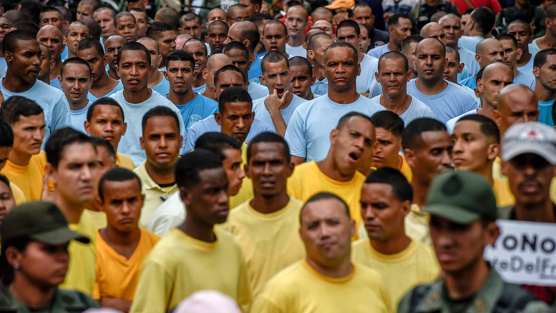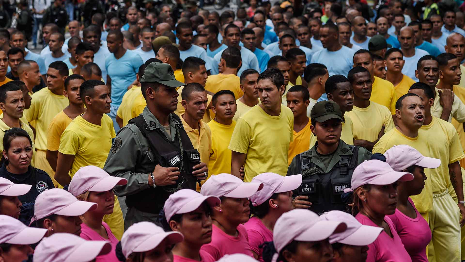 Vestidos de pies a cabeza con uniformes azul celeste, amarillo y fucsia, 300 reclusos -hombres y mujeres- se concentraron ante la sede principal del Ministerio Público, en el centro de la capital, custodiados por militares de la Guardia Nacional.
