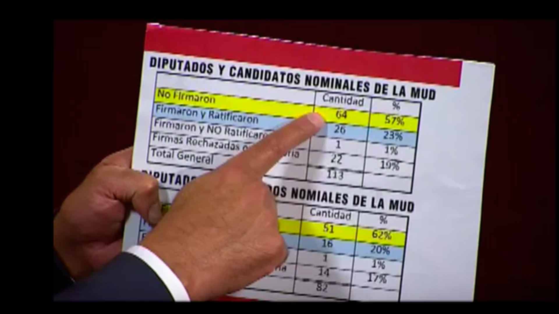 También señaló que de los diputados adjudicados nominales de la MUD a la Asamblea Nacional (AN), un 62% no firmó, es decir, 51 parlamentarios.