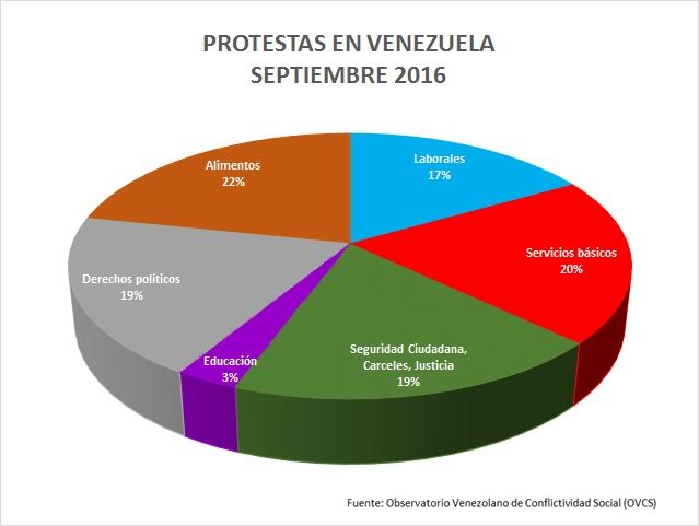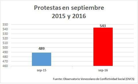 El OVCS registró en septiembre de 2016 al menos 543 protestas. Esta cifra equivale a 18 protestas diarias en todo el país. En comparación con igual mes del año pasado, esta cifra representó un incremento de 11%.
