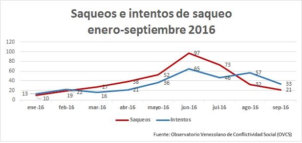Los saqueos e intentos de saqueo continúan en todo el país. Sin embargo, al observar los 678 casos documentados por el OVCS durante los nueve meses de 2016, se aprecia una clara disminución desde el pasado mes de julio.