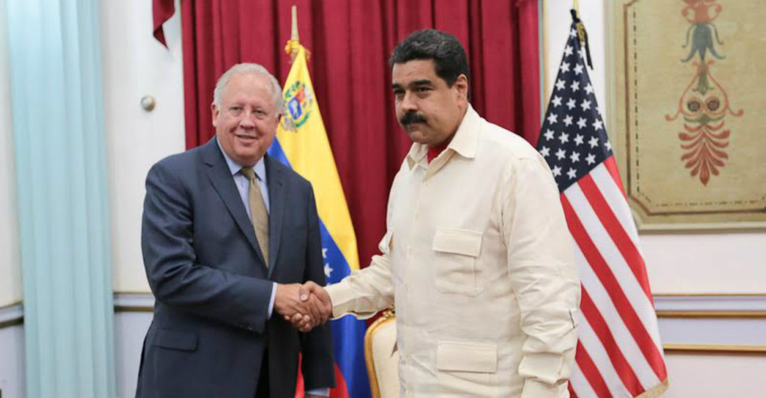 Maduro recibió al representante del gobierno estadounidense en la sede del Ejecutivo Nacional, en Caracas, y en la reunión participaron varios funcionarios gubernamentales como el alcalde del municipio Libertador, Jorge Rodríguez; la ministra de la Secretaría de la Presidencia, Carmen Meléndez, así como el exembajador de Venezuela ante la OEA, Roy Chaderton.