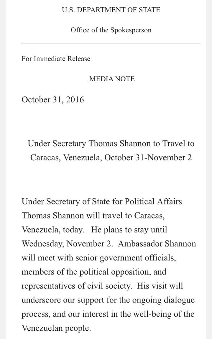 Shannon mantendrá en la capital venezolana reuniones con «altos funcionarios del gobierno, miembros de la oposición política y representantes de la sociedad civil», y deberá «destacar nuestro apoyo» al diálogo iniciado el fin de semana, indicó el Departamento de Estado.