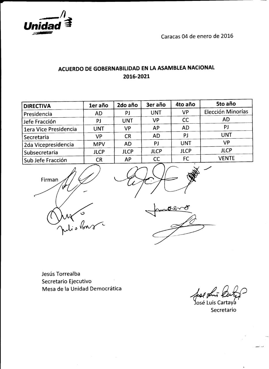 En virtud de lo establecido en el “Acuerdo de gobernabilidad en la Asamblea Nacional 2016-2021”, que fue suscrito por las fuerzas de la Mesa de la Unidad Democrática el día 4 de enero de 2016, la rotación en el resto de los cargos para el ejercicio de las funciones parlamentarias en 2017 será de la siguiente manera: (i) Jefatura de Fracción de la Bancada de la Mesa de la Unidad Democrática, Un Nuevo Tiempo; (ii) Primera Vicepresidencia de la AN, Voluntad Popular; (iii) Segunda Vicepresidencia de la AN, Acción Democrática; (iv) Secretaría de la AN, la Causa R; (v) Subsecretaría, José Luis Cartaya.