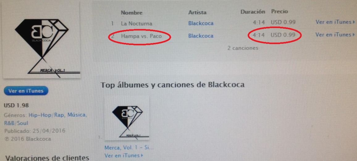 Se pudo conocer que el grupo Black Coca, comercializaba su música en iTunes en 0,99 centavos de dólar: