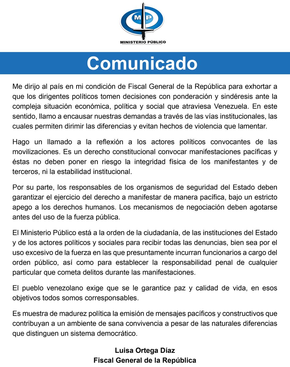 La Fiscal General de la República, Luis Ortega Díaz, hizo un llamado formal mediante un comunicado a la oposición para que se manifieste de forma pacífica, de acuerdo a la Constitución Nacional y al gobierno venezolano para que respete las movilizaciones, los derechos derechos humanos y agote las negociaciones antes de reprimir a opositores.