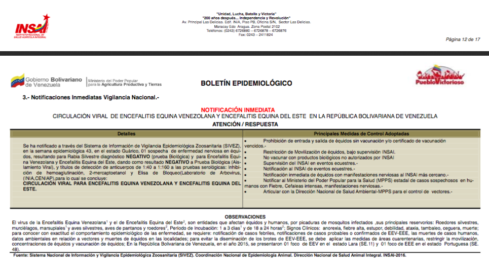 Otra discrepancia entre los datos presentados por el ministerio y las informaciones que se conocieron durante el año pasado está la relacionada con la encefalitis equina. La Sociedad Venezolana de Salud Pública alertó que en el último trimestre de 2016 se presentaron casos de enfermedad neurológica en équidos en Barinas, Guárico y Merida.