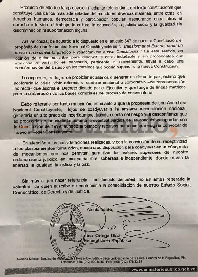 Según la carta, fechada el 17 de mayo, enviada por la fiscal a Elías Jaua Milano, presidente de Comisión Presidencial encargada de la Constituyente, Ortega Díaz también fue invitada a asistir el jueves 18 de mayo al salón Boyacá del Palacio de Miraflores a una reunión y en la cual se explicarían las motivaciones, líneas programáticas y los métodos de elección directa universal y secreta. “Asimismo me informa que como parte de los objetivos de la actividad está el recibir aportes, observaciones y recomendaciones” señala la Fiscal.