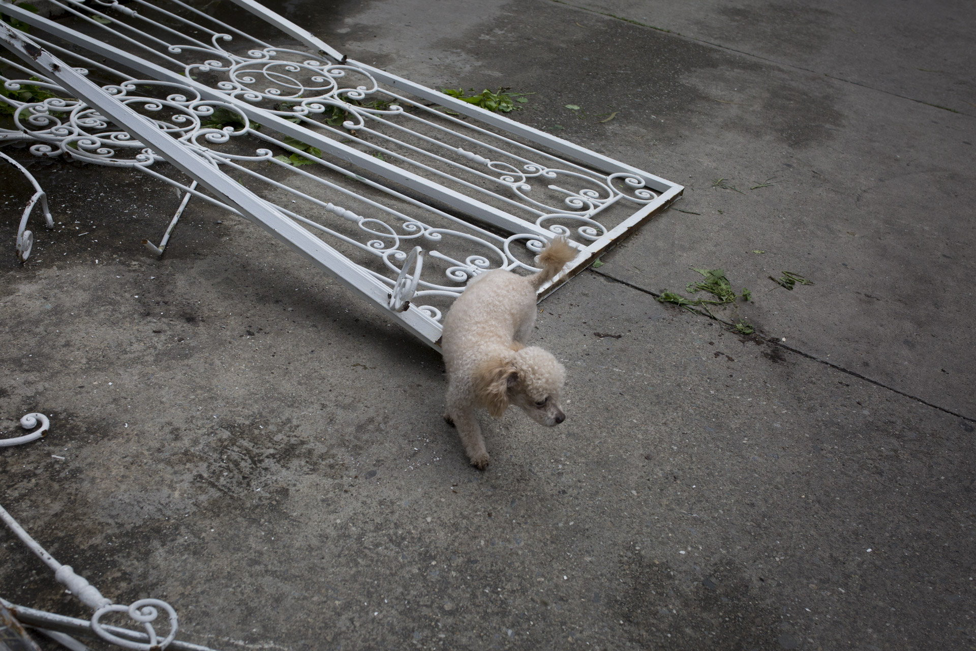 Un perro de la vecindad inspecciona los daños que dejaron efectivos de los cuerpos de seguridad del Estado