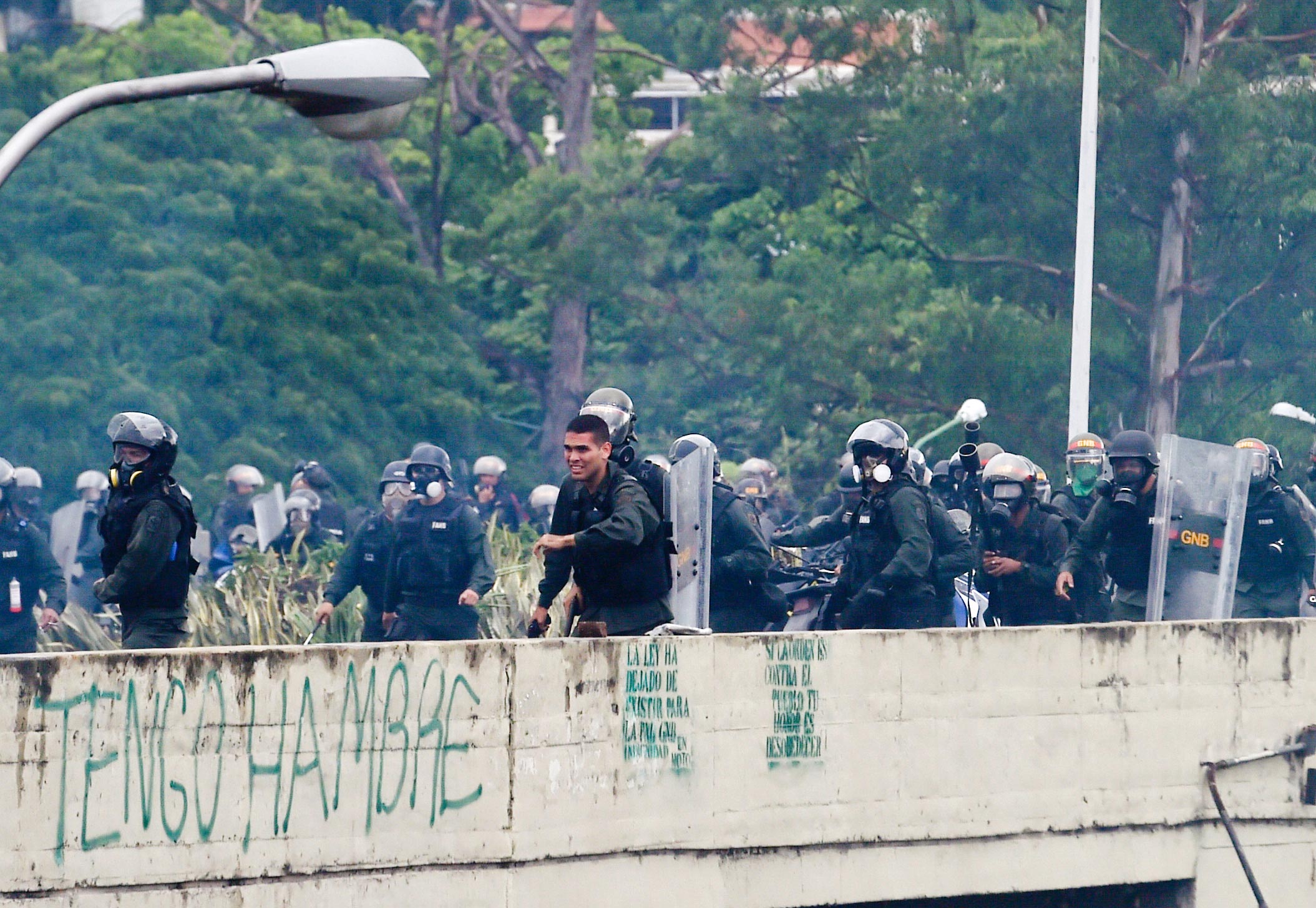 Una foto de la agencia AFP, que está en la portada de esta nota, de la protesta de hoy en Altamira muestra a un miembro de la Guardia Nacional Bolivariana que sostiene un arma de fuego durante enfrentamientos con opositores. Esta es otra de las imágenes capturadas por la agencia: