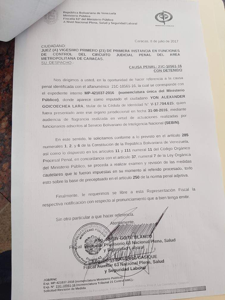 La Fiscalía pidió al juez vigésimo primero de control del Área Metropolitana de Caracas que se revisen las medidas cautelares impuestas hace cinco meses a Yon Goicoechea y que se proceda a su liberación.