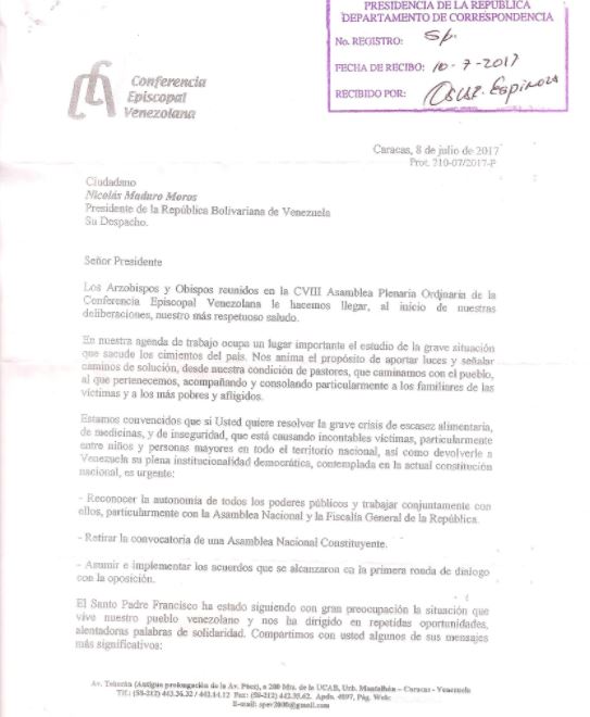 La carta tiene fecha de emisión 8 de julio y de recibido 10 de julio. Añade unas palabras dada por el papa Francisco quien, aseguran, sigue “con gran procupación la situación que vive nuestro pueblo venezolano”.
