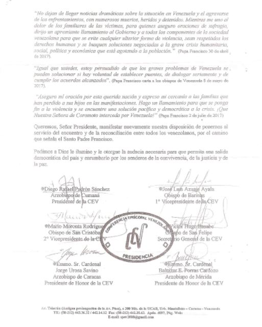 La misiva firmada por los representantes de la CEV argumenta que si el Presidente quiere «resolver la grave crisis de escasez alimentaria, de medicinas, y de inseguridad, que está causando incontables víctimas, particularmente entre niños y personas mayores en todo el territorio nacional, así como devolverle a Venezuela su plena institucionalidad (debe) retirar la convocatoria de una Asamblea Nacional Constituyente”.
