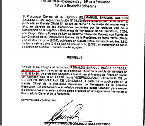 Reinaldo Muñoz es procurador encargado, en el cargo del cual también fue en su oportunidad encargado ilegalmente Manuel Galindo, pues en su momento cuando fue designado la Asamblea Nacional no dio el visto bueno.
