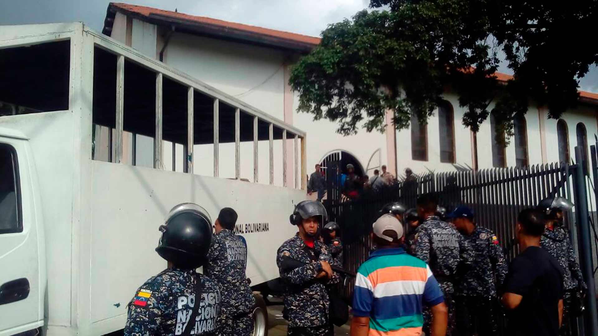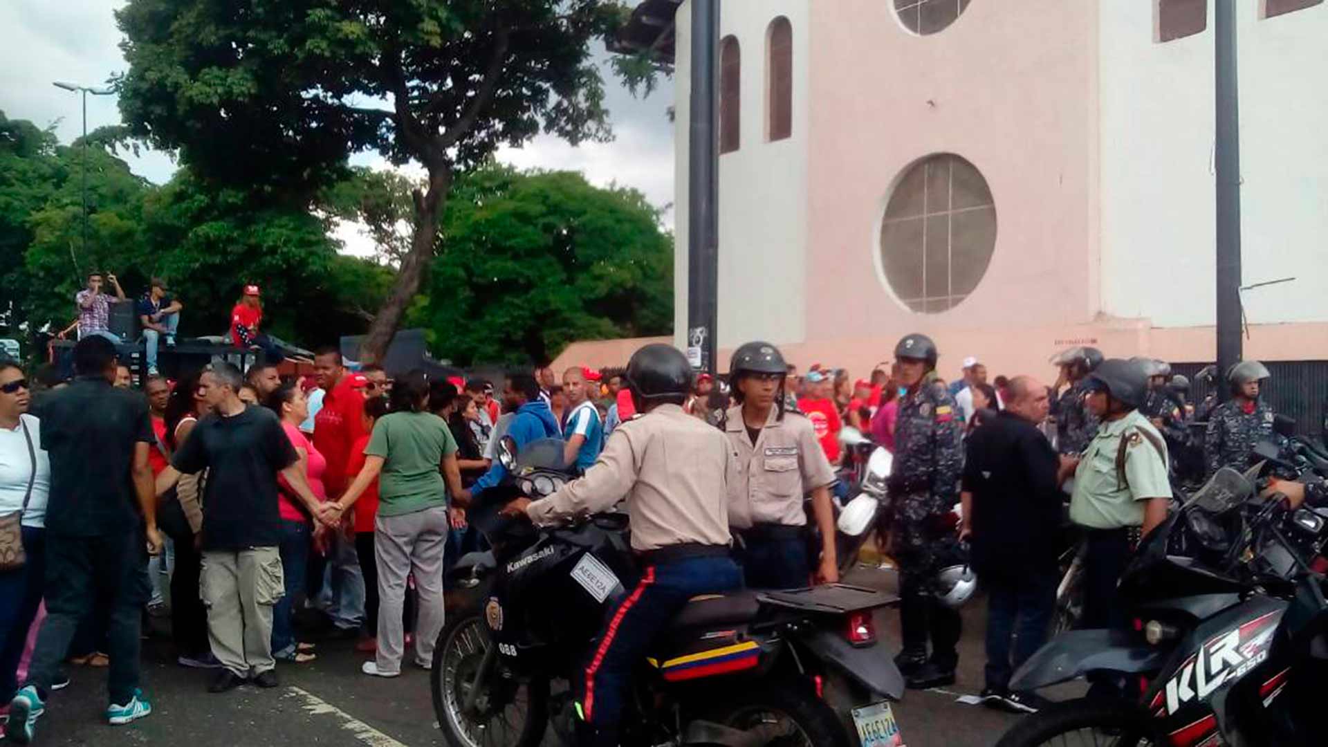 Pasadas las 3:00 pm, el templo estaba rodeado de policías. Hasta la reja de entrada metían los autobuses que utilizaron para sacar a los ciudadanos que estaban dentro. Apenas se asomaron por la entrada del templo, los gritos de los de afuera se hicieron más fuertes. “Esto no es Chacao. Vete para tu Chacao”, “guarimberos”, “fascistas” y “asesinos”, insistían.