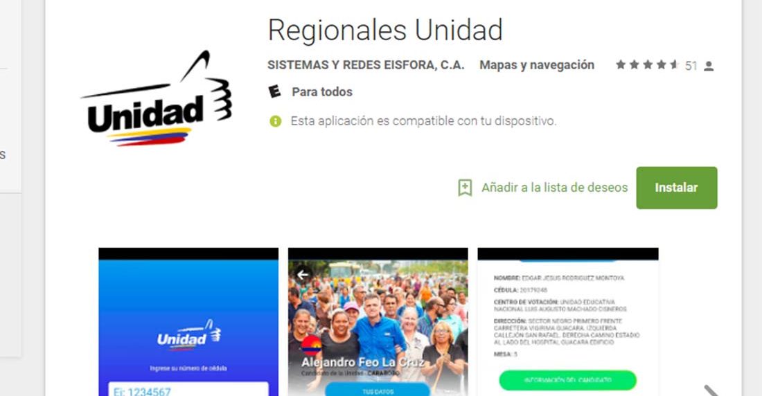 La aplicación lleva el nombre de «Regionales Unidad» y fue creada con el propósito de «superar la falta de información oportuna por parte del Consejo Nacional Electoral (CNE)», según informó la alianza opositora en su página web.