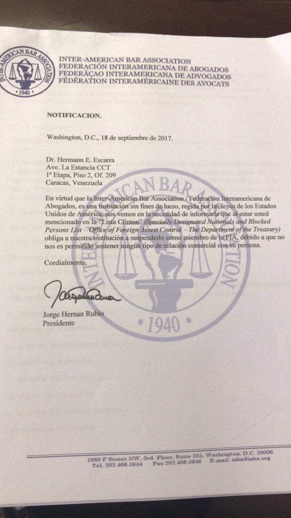 En una carta, con fecha del 18 de septiembre, el gremio internacional notifica al experto constitucional que, según las leyes estadounidenses, “no es permitido sostener ningún tipo de relación comercial con su persona y al estar usted mencionado en la Lista Clinton obliga a nuestra institución a suspenderlo como miembro de la FIA”, detalla el comunicado.