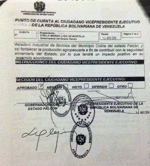 Es así como en marzo 2013 con el decreto 205, Montilla transfiere a la Secretaría de Desarrollo Agrícola del Ejecutivo del estado Falcón la competencia de “culminación, consolidación y puesta en marcha” de una serie de proyectos, entre esos el Matadero, asignados a Corpofalcón para su ejecución. Pero un año más tarde, en junio 2014, por oficio Nro. 00-0471-14 se pide una modificación presupuestaria por Bs. 35 millones, para la culminación del matadero, obra: PI-2014-01-E-10-135-1032. La excusa es “en vista de la situación planteada en el país, sometido a una guerra económica, inducida e impuesta por la burguesía…”.