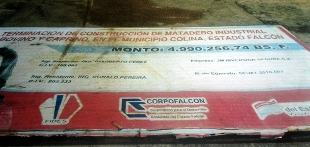 Uno de los casos más vulgares es el del “Matadero Industrial Bovino y Caprino” en el municipio Colina. Se hizo un convenio, en euros, con Portugal para el matadero, en la carretera que lleva de Coro a la Sierra.