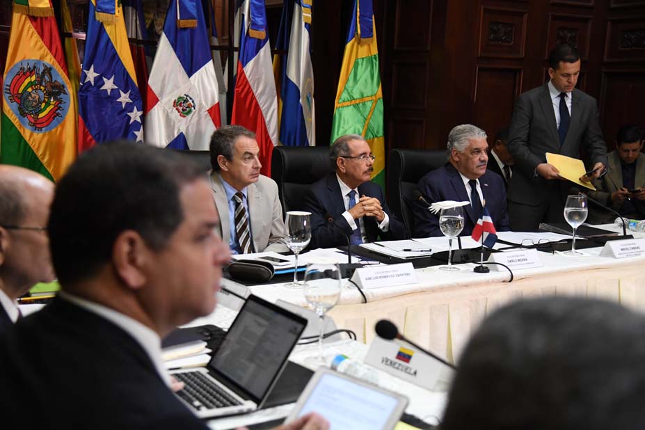 Al llegar los protagonistas, cada uno fue conducido a salones distintos cual boxeadores, mientras el presidente Danilo Medina hablaba por separado con cada esquina (Gobierno y MUD). Finalmente ambos quintetos fueron conducidos al salón donde se mirarían cara a cara. El gobierno dominicano tiene buenas expectativas, las partes no tanto.