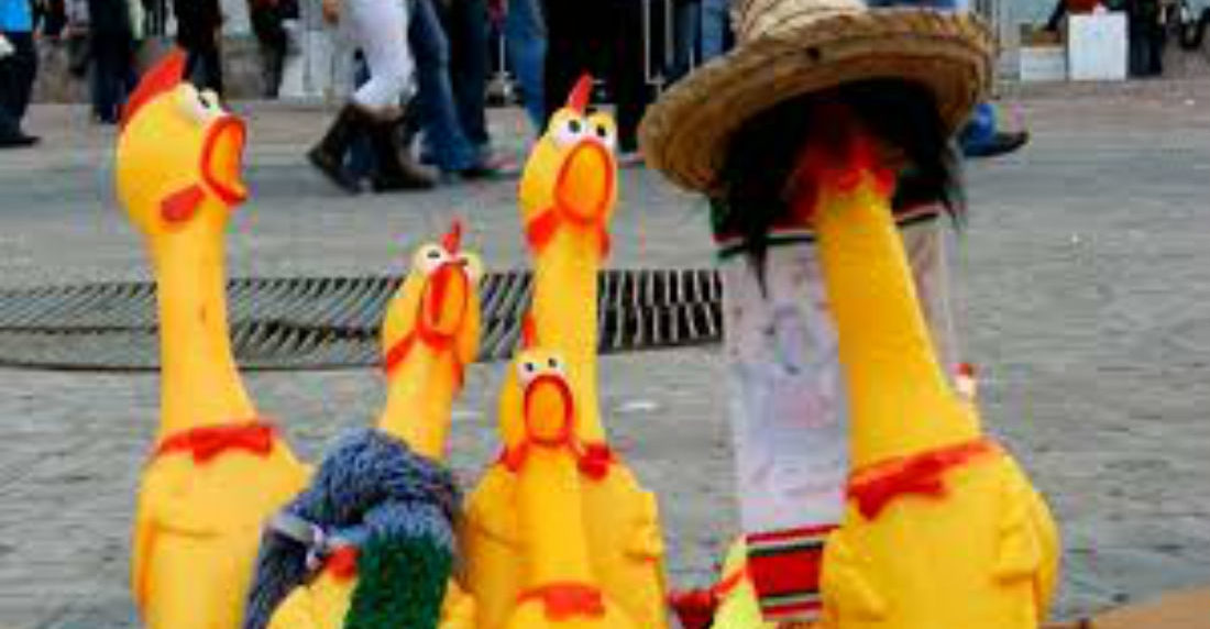 Uno de los juguetes rechazados por habitantes de la parroquia 23 de Enero, al oeste de Caracas, fue el «pollo chillón»: un muñeco de hule, de color amarillo, que emite sonidos que emulan el graznido de una gallina, un accesorio destinado para los animales, especialmente para que los perros se diviertan al morderlo. Aunque también los caballos pueden jugar con ellos.
