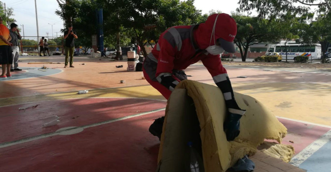 Pasadas las 8 de la mañana (hora local de Colombia) las autoridades llegaron a la cancha donde se ejecutó la acción sin violencia, logrando la desocupación total de unas 150 personas entre hombres, mujeres y niños. Funcionarios con guantes y tapabocas retiraron colchonetas y otros enseres dejados en el polideportivo .