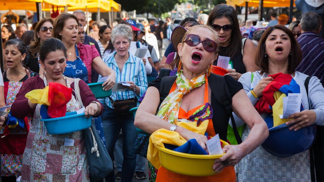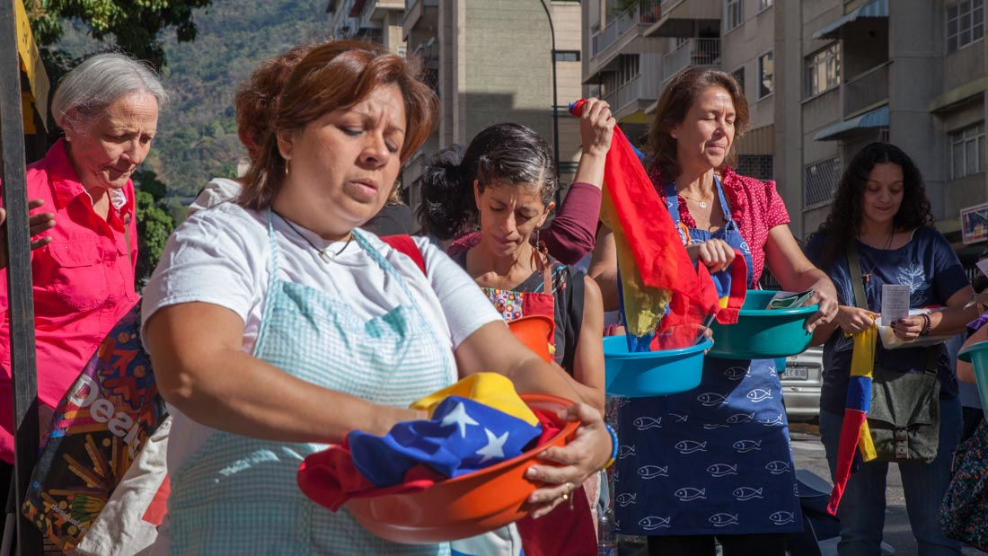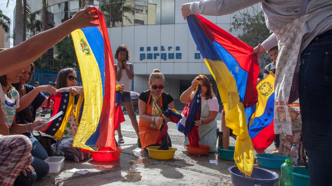 Mientras lavaban banderas de Venezuela como acto simbólico, un grupo de mujeres recorrió el mercado de Los Palos Grandes entonando cantos de pilón.