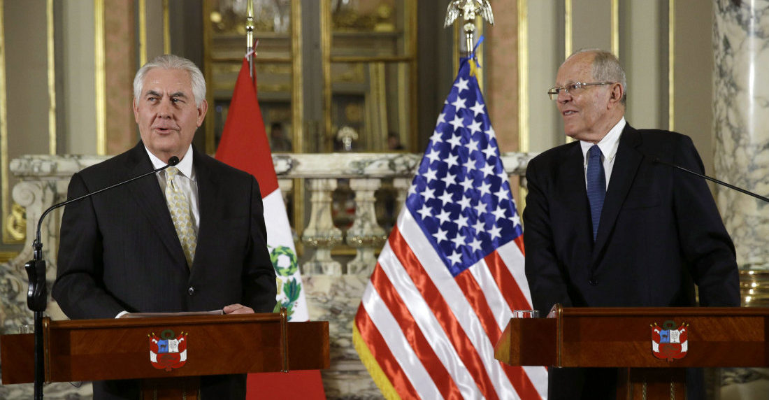 El secretario de Estado de los Estados Unidos, Rex W. Tillerson, agradeció este martes al presidente de Perú, Pedro Pablo Kuczynski, el liderazgo de su país mediante el Grupo de Lima para «abordar la destrucción terrible que existe en este momento en la democracia venezolana»Tillerson culminó este 6 de febrero su visita a Perú con una reunión con Kuczynski en el Palacio de Gobierno de Lima donde ambos intercambiaron ideas sobre las acciones a emprender para lograr que Venezuela «vuelva a su ruta institucional».