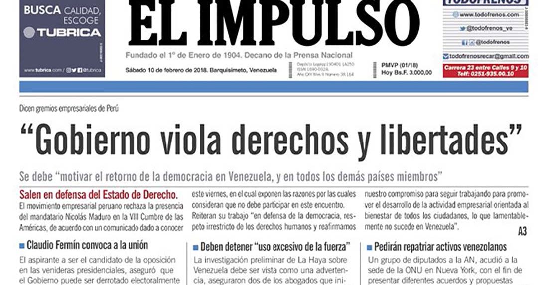 «Hasta hoy nos permiten circular (…) Nuestro futuro luce incierto. No escapamos de la calamidad que vive Venezuela en lo político, social y económico», publicó este sábado el Diario El Impulso de Barquisimeto en su editorial de despedida, luego de 114 años de existencia en el mercado de medios de comunicación venezolanos.