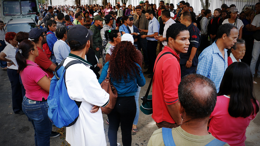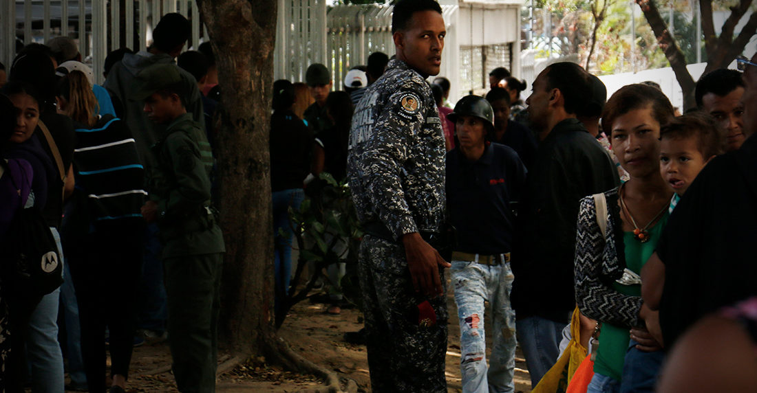 Dos guardias nacionales y tres agentes de la Policía Nacional Bolivariana intentaron apresar al periodista cuando intentó grabar con un dron la cola, en la que decenas de personas madrugaron para comprar dos kilos de harina de maíz precocida y uno de azúcar en el supermercado, ubicado en Santa Eduvigis.