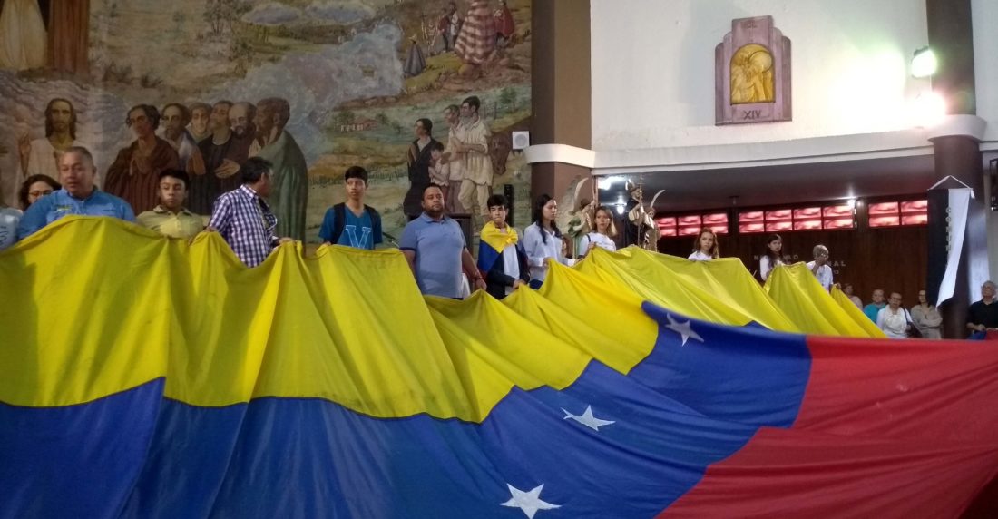 La ceremonia religiosa se inició con la llegada de un gigantesco tricolor nacional que ondeaba en manos de dirigentes locales del partido Primero Justicia (PJ), representantes de la Asamblea Nacional, movimiento estudiantil, la ONG “Te Propongo Paz”, periodistas de la región y sociedad civil.