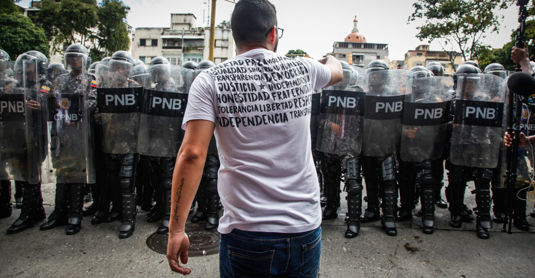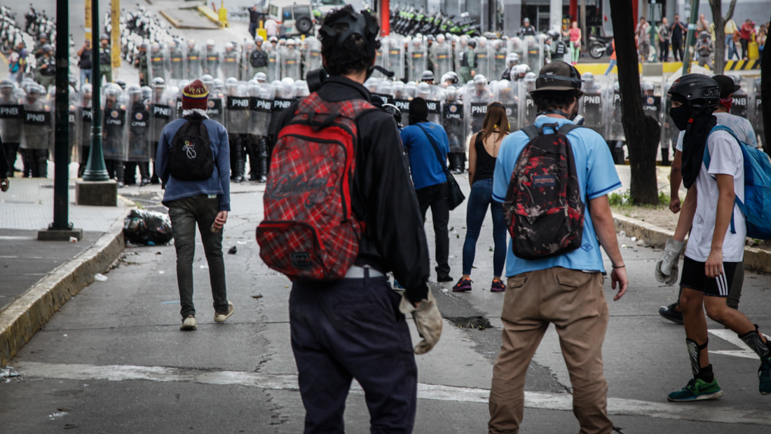 La Policía Militarizada usó motos que llegaron a escasos metros de la entrada de la UCV para dispersar a los jóvenes. Los estudiantes lanzaban piedras, botellas y basura mientras que la PNB respondía con gas pimienta y bombas lacrimógenas. Bombas para las que tampoco estaban preparados los efectivos policiales pues tres de ellos tuvieron que ser auxiliados por el efecto de los gases.