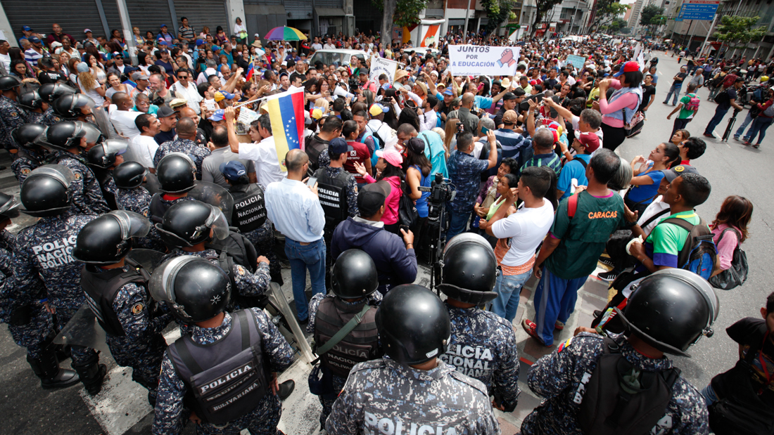 En el lugar, se encontraban funcionarios de la Policía Nacional Bolivariana (PNB), quienes trataron de frenar el paso de los manifestantes, lo que generó el enfrentamientos entre uniformados y civiles. Sin embargo, los educadores lograron pasar el piquete policial y continuar con la protesta.