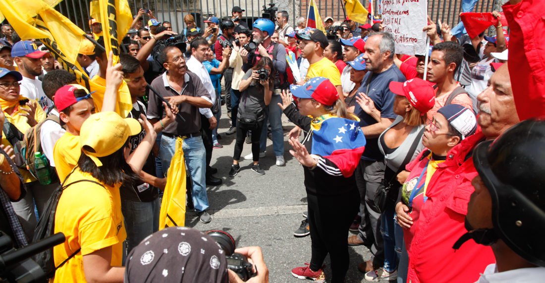A escasos metros de los opositores, un grupo de chavistas se agrupó con pancartas en apoyo a Nicolás Maduro. Pasaron algunas «perreras«, vehículos improvisados para trasportar personas- con simpatizantes del partido socialista PSUV con altavoces. Unos siguieron su camino sin mayor conflicto y otros se quedaron en la plaza mientras la oposición dio inicio a su caminata.