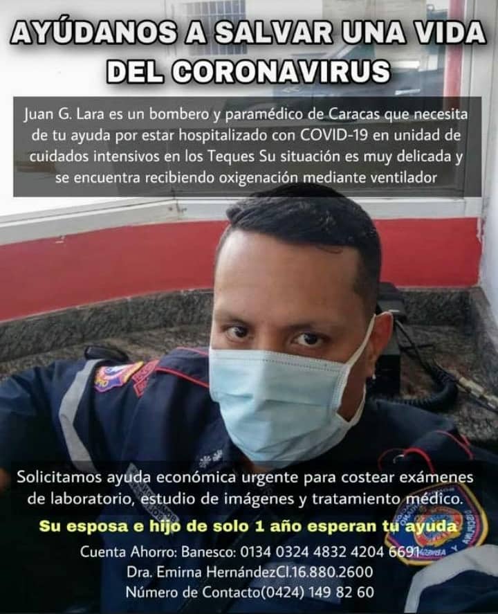 Como Juan Lara fue identificado el primer funcionario del Cuerpo de Bomberos que fallece en Venezuela por covid-19, la enfermedad respiratoria grave causada por el nuevo coronavirus, revelaron este martes fuentes vinculadas al caso. Hasta el último momento sus familiares pidieron ayuda de caridad para atenderlo en un hospital público del quebrado Estado venezolano. Los deudos ni siquiera tenían para pagar los funerales.