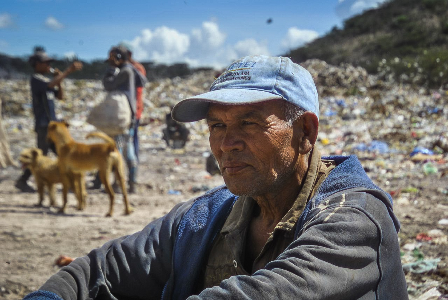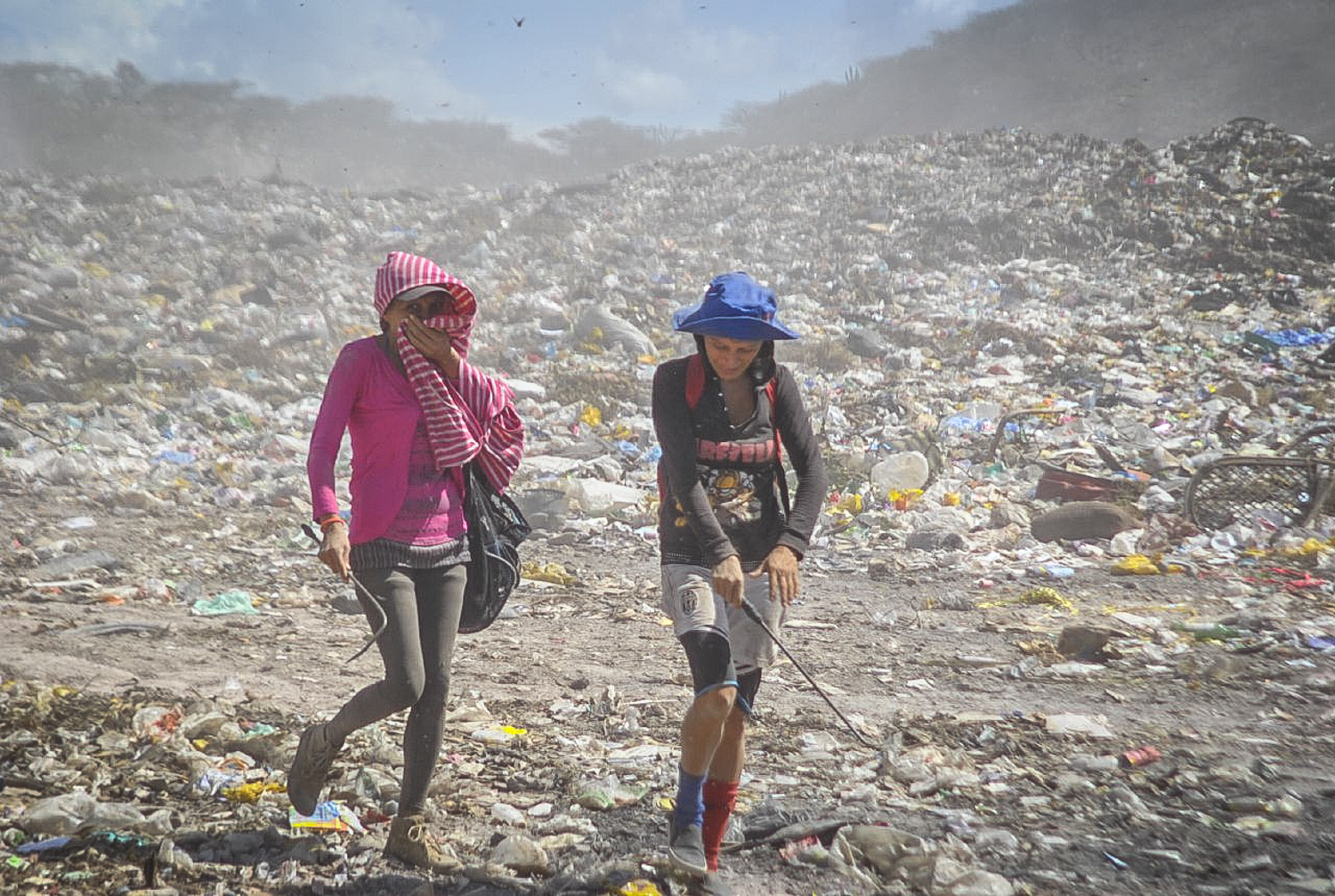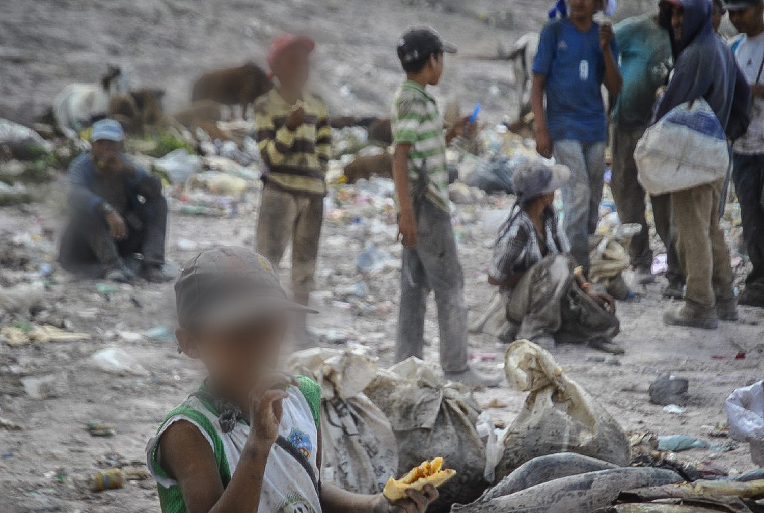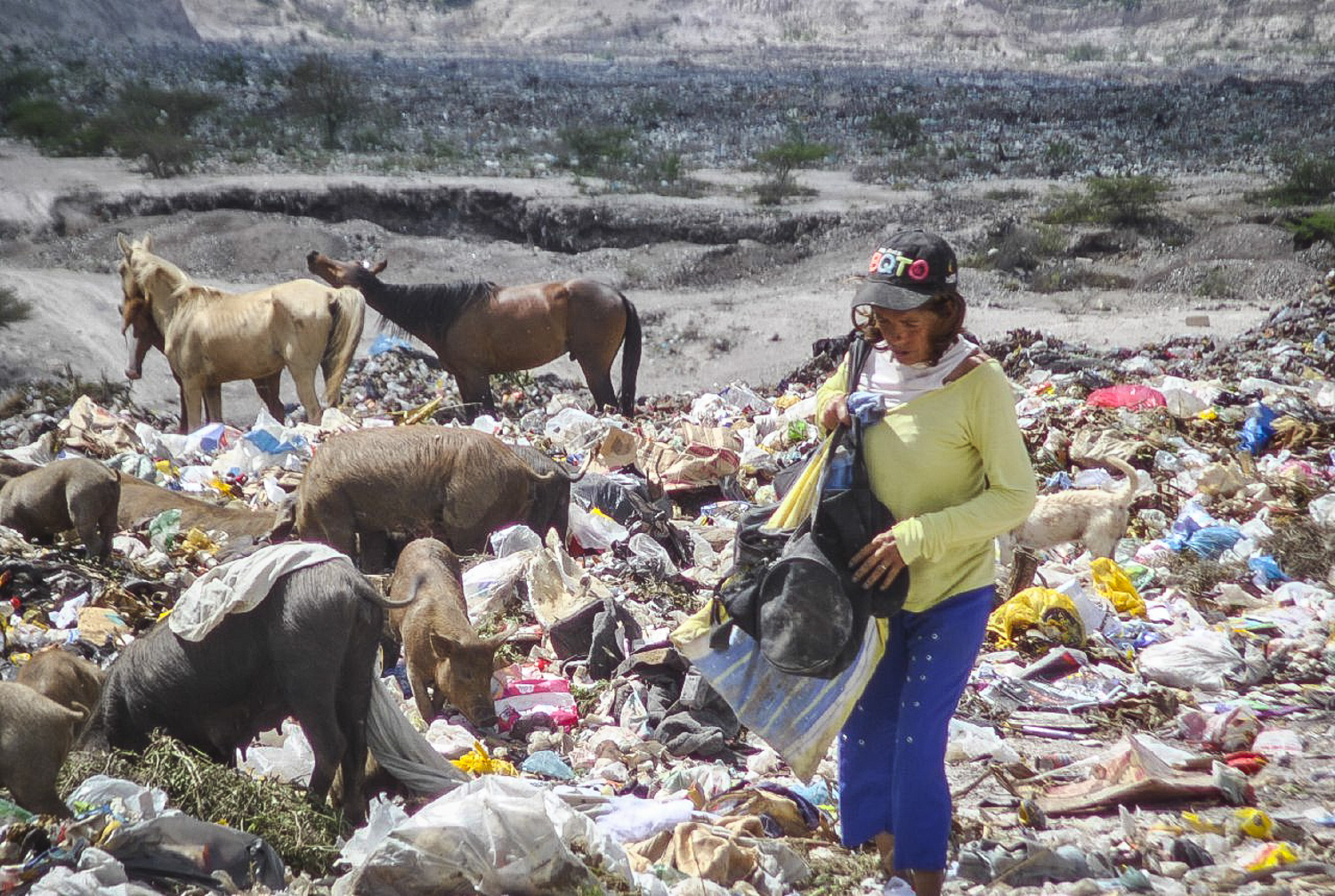 La ruta de entrada que abre camino al tránsito de los camiones del aseo urbano es solo un canal de suspenso hasta el terreno devastado donde se vierte la basura. Pero no solo la basura puebla el lugar: al menos 300 personas, entre niños, mujeres jóvenes y adultos, adolescentes y hombres, además de perros, cerdos y hasta caballos y burros, se entremezclan con los promontorios de desechos.