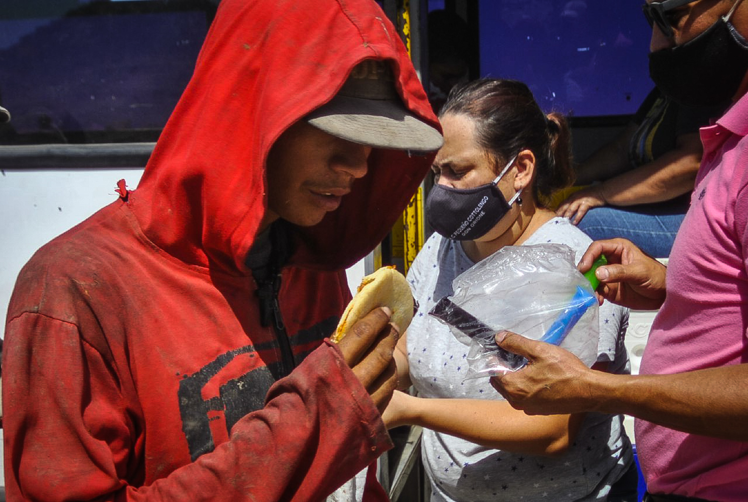 Por lo general, me gusta observar a las personas con discreción, pero siempre con empatía. Acercarme a ellas -si me lo permiten- y conocer un poco de su historia. Pero en esta oportunidad no hubo ocasión de entablar conversación con alguien. Todo sucedió muy rápidamente. Iba acompañada de otros dos fotógrafos, a los que perdí de vista. Ni siquiera llegué a alejarme 10 metros del autobús donde el equipo repartía las arepas.