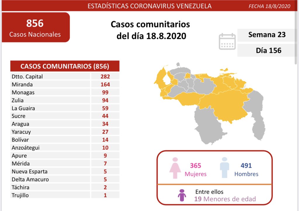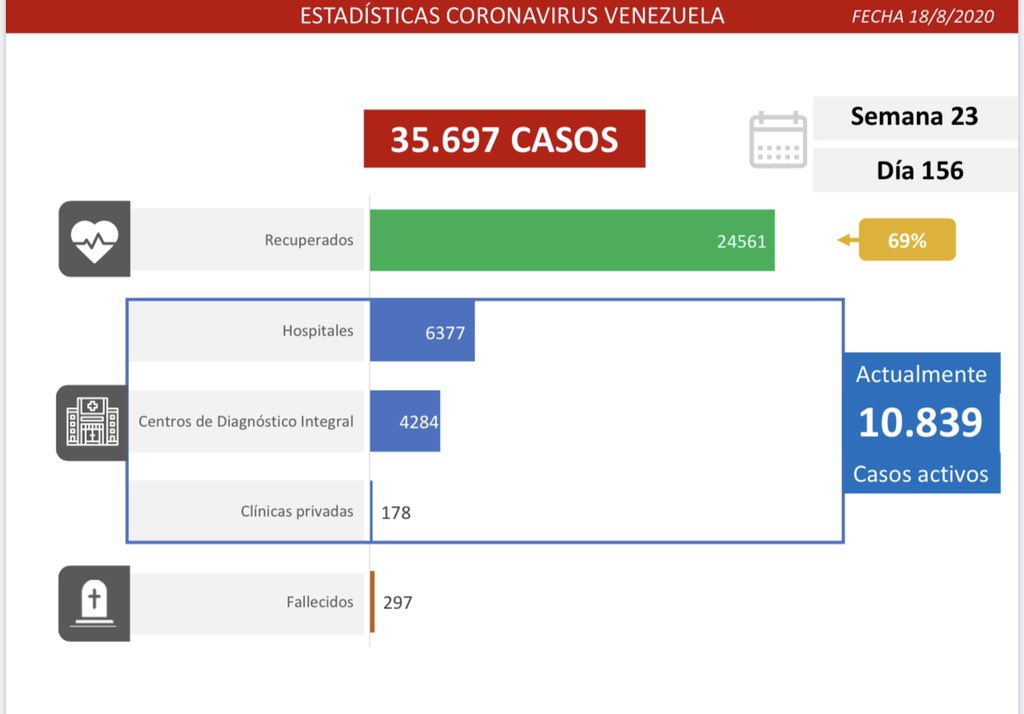Esta vez no fueron 7 tuits, sino 6. La vicepresidenta de Nicolás Maduro, Delcy Rodríguez, dio el balance de contagiados en 6 mensajes. En el primero informó que se detectaron 895 nuevos contagios en Venezuela y en el tercero que 9 personas fallecieron. Eso da un total de 35.697 casos de COVID-19 y 297 muertes para el 18 de agosto.