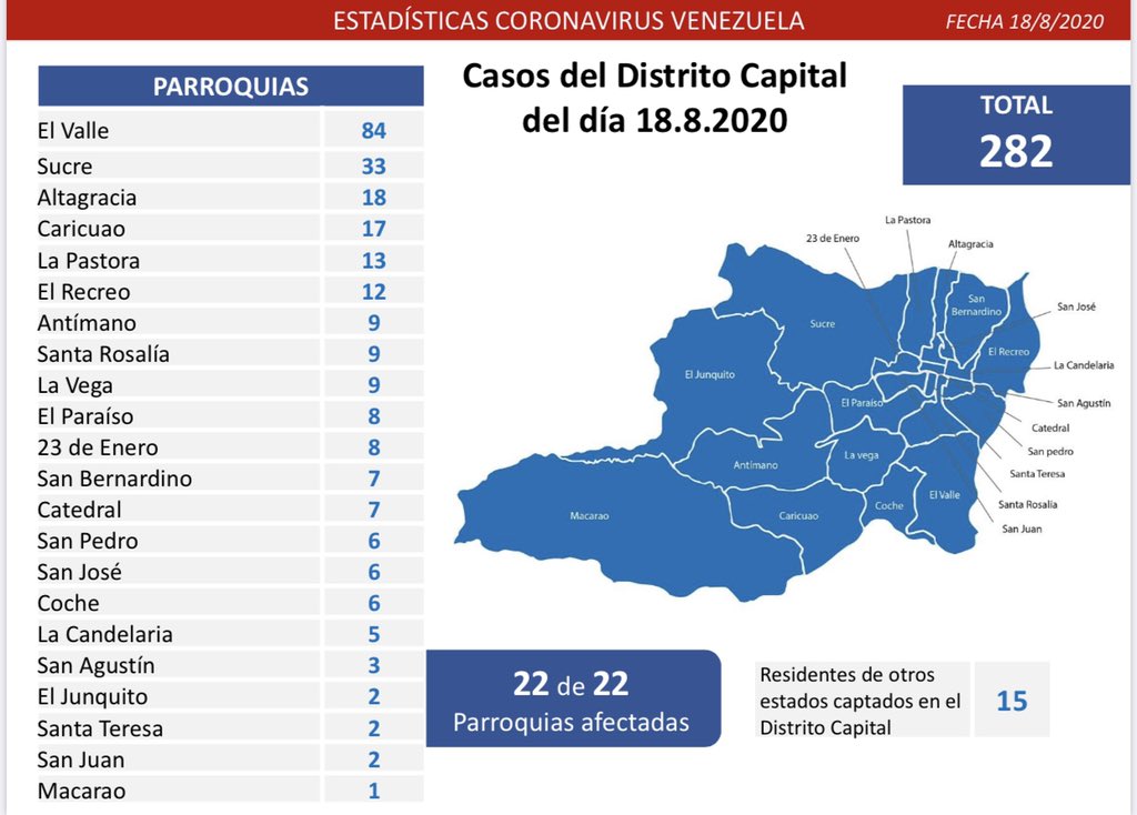 Los «casos comunitarios» de coronavrus se siguen concentrando en Distrito Capital (282) y sus parroquias: