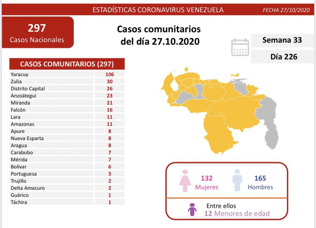Focos que antes contabas sus casos por tres dígitos, como Zulia y Caracas, hoy no superan las tres decenas de contagios. Así, de acuerdo con Rodríguez, 297 casos son «de transmisión comunitaria» y 56 «importados». Estos últimos son todos provenientes de Colombia.