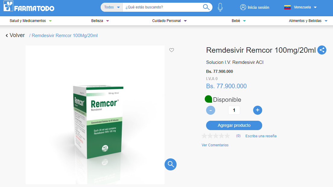 En este momento, el precio del remdesivir que se oferta en Farmatodo se encuentra en Bs. 77.900.000, lo que equivale a $155.