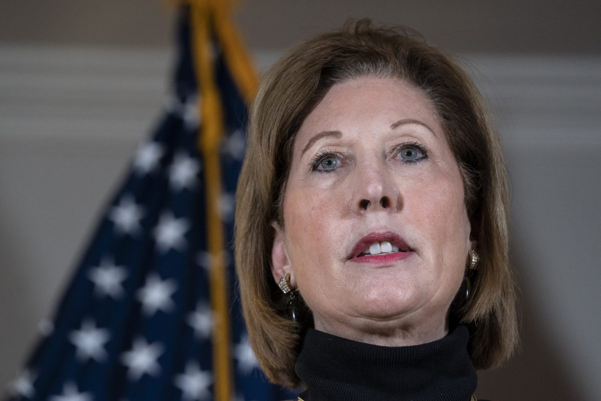 La abogada Sidney Powell habla con la prensa sobre varias demandas relacionadas con las elecciones de 2020, dentro de la sede del Comité Nacional Republicano Drew Angerer/Getty Images/AFP