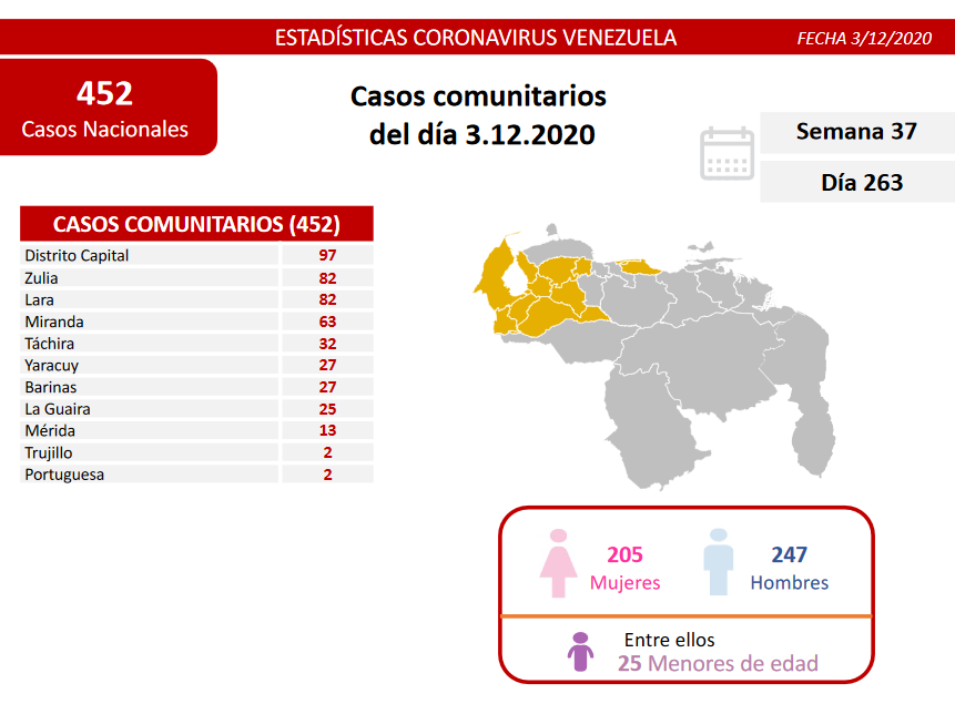#BalanceCovid19➡️Hoy #3Dic se cumplen 263 días de la pandemia en Venezuela, informamos que durante las últimas 24 horas el país registró 481 nuevos contagios por #Covid19, 452 de transmisión comunitaria y 29 casos importados