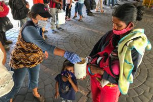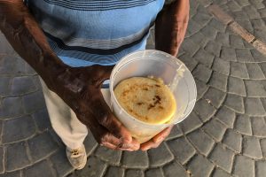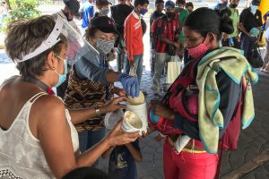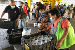 Desde que comenzó la pandemia por el nuevo coronavirus, el grupo del María Auxiliadora entrega un estimado de 300 comidas diarias. Ha habido jornadas en las que han logrado suministrar hasta 2.000 viandas. Los alimentos son procesados en las casas de los colaboradores y envasados en recipientes de 500 gramos. Cuando presenciamos el trabajo del grupo, la provisión consistió en una ración de granos y una arepa por comensal.