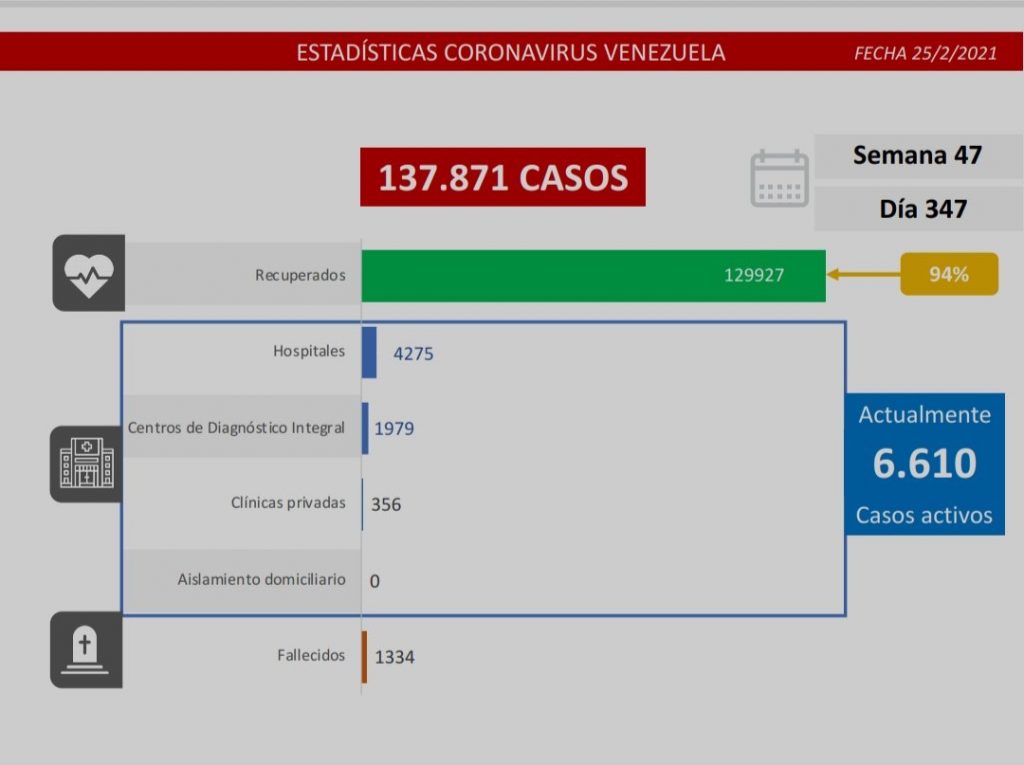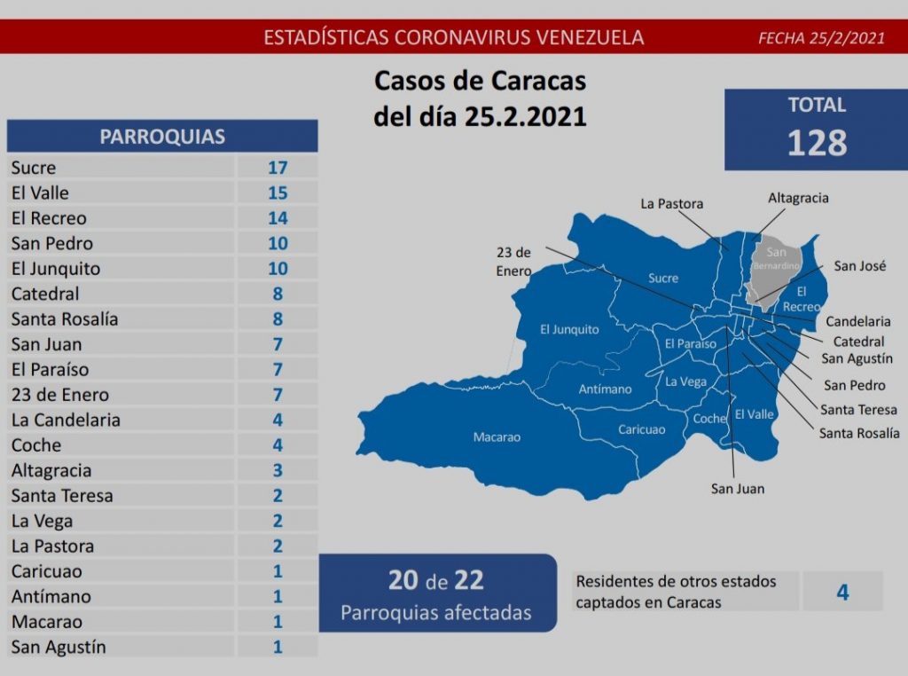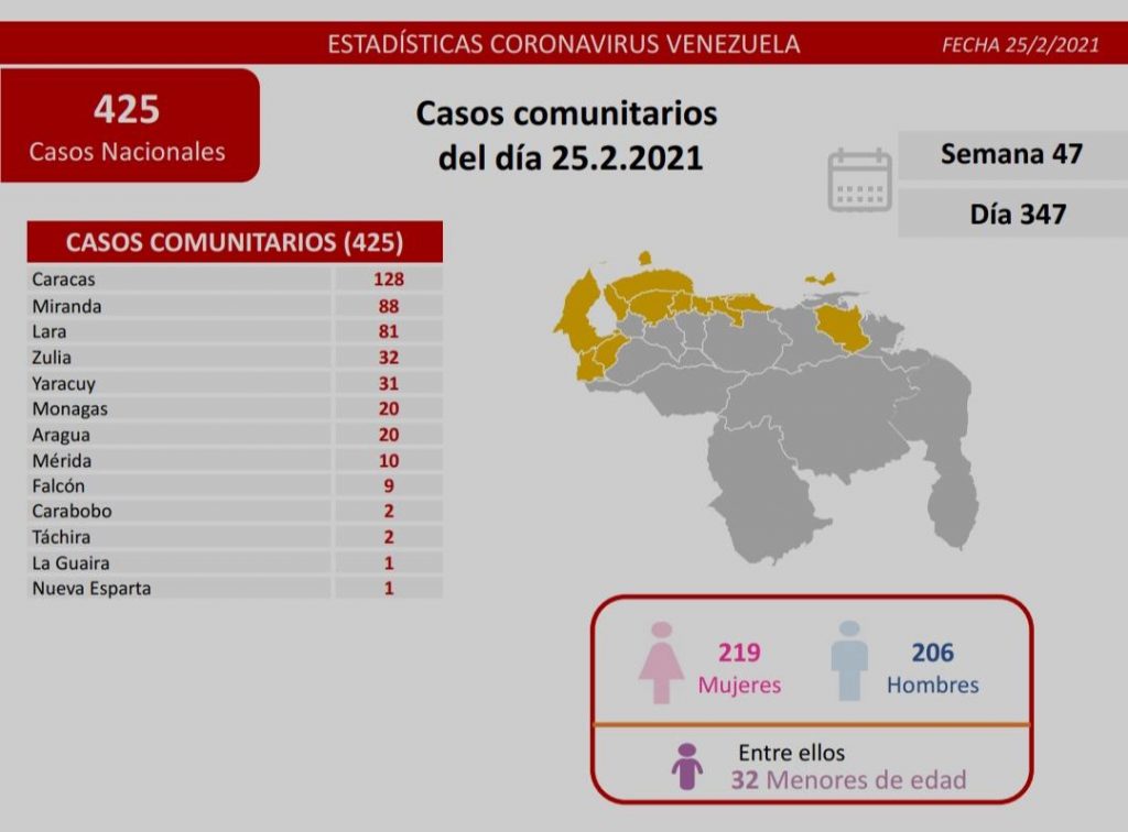 «Los casos comunitarios están ubicados en los siguientes estados: Caracas 128, Miranda 88, Lara 81, Zulia 32, Yaracuy 31, Monagas 20, Aragua 20, Mérida 10, entre otros que se detallan en la lámina», reportó el funcionario desde su cuenta en Twitter este 25 de febrero.