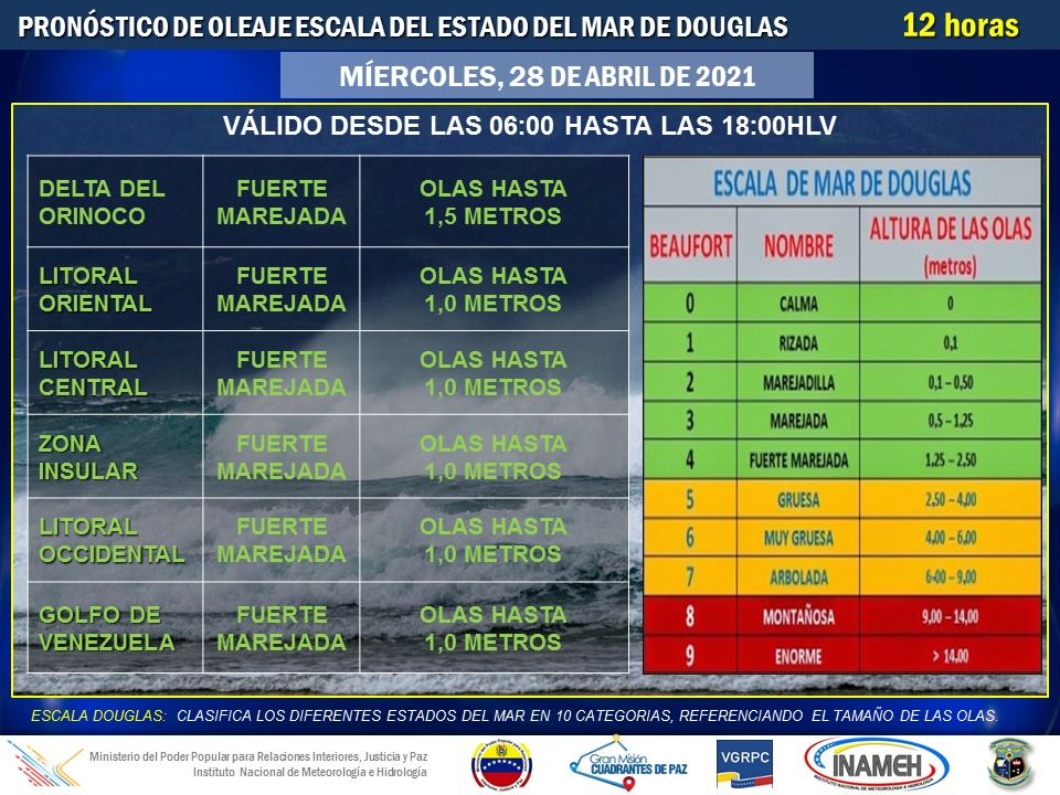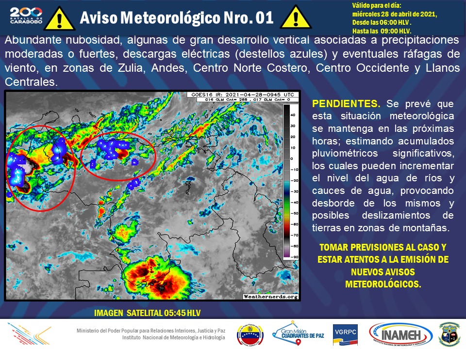 En su reporte expresan que «vaguada en altura sobre el mar Caribe origina inestabilidad atmosférica en buena parte del país, propiciando nubosidad de mediano y gran desarrollo vertical con precipitaciones de intensidad variable, algunas acompañadas de actividad eléctrica, en zonas de Centro Occidente, Centro Norte Costero, Llanos Centrales y Occidentales».