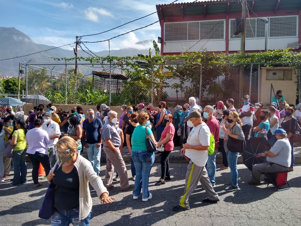 En ninguna de las colas de vacunación del municipio Sucre hay distanciamiento social. Foto Daniel Hernández / @danielimagengrafica