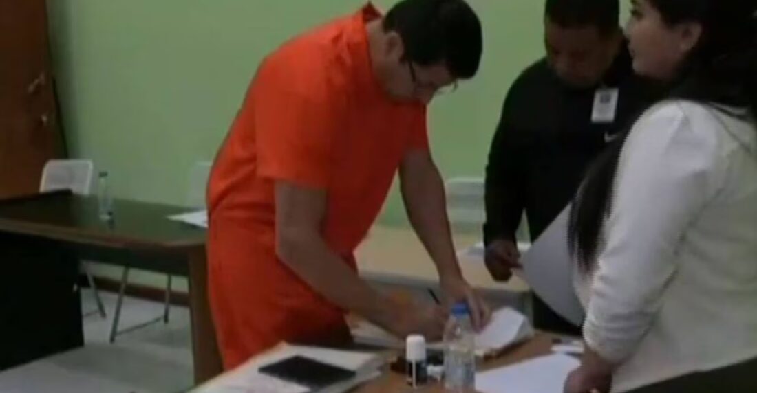 Los detenidos llegaron esposados y vestidos de traje naranja a una sala de audiencia en la que le esperaban 3 fiscales y 5 defensores, donde se realizó el proceso de detención, toma de huellas y firma de documentos.